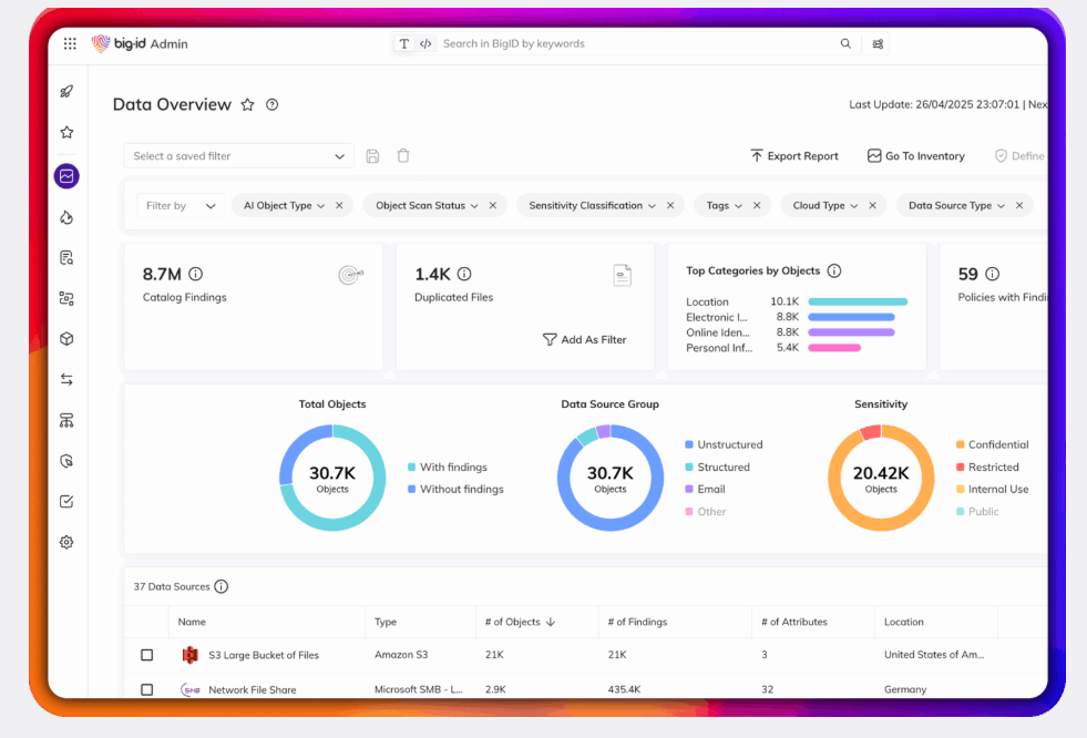 Mediante IA avanzada, BigID identifica automáticamente datos personales, críticos y sensibles en todos los entornos — cloud, on-premise, bases de datos, aplicaciones y SaaS — entregando visibilidad completa y accionable.